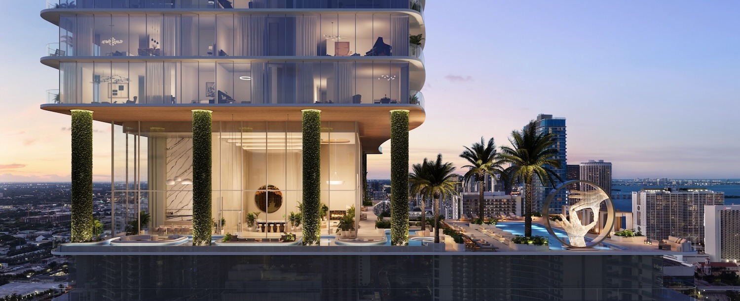 The Residences at 1428 Brickell takes the third-space idea and gives it a dramatic skyline backdrop. Sitting on the 67th floor is Brickell’s largest two-story wine and spirits room, and it reads more like a luxe private club than a building amenity.