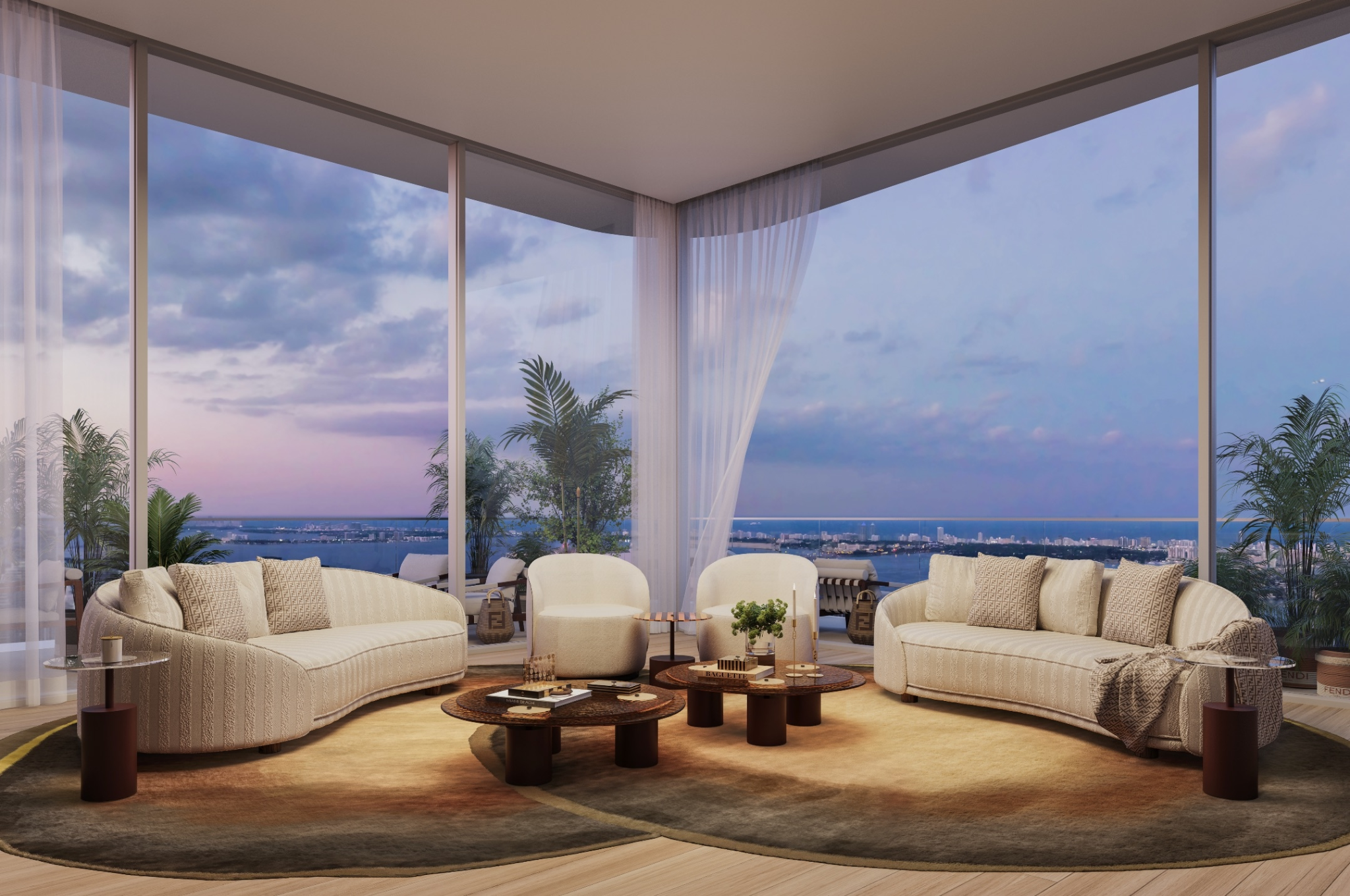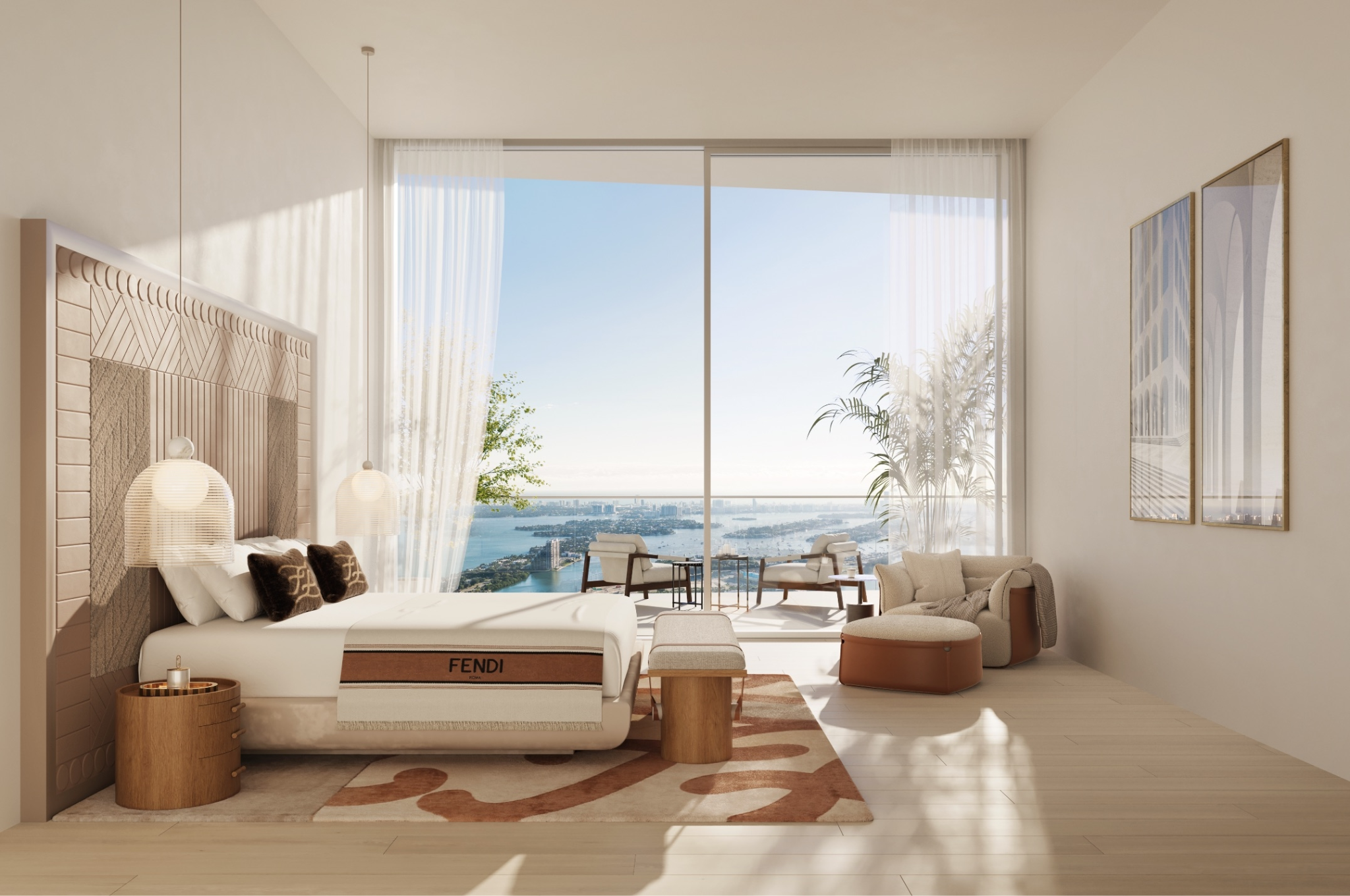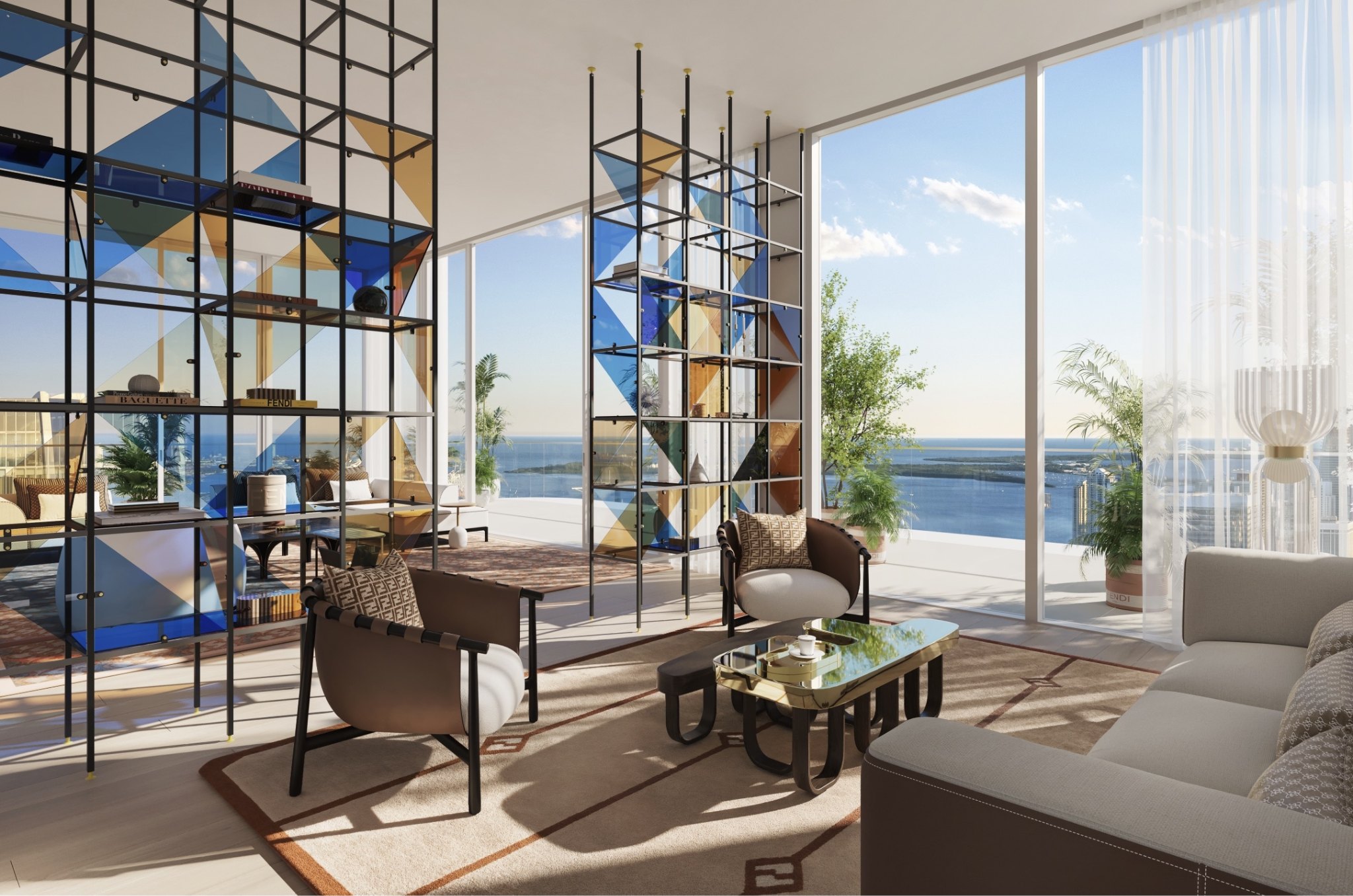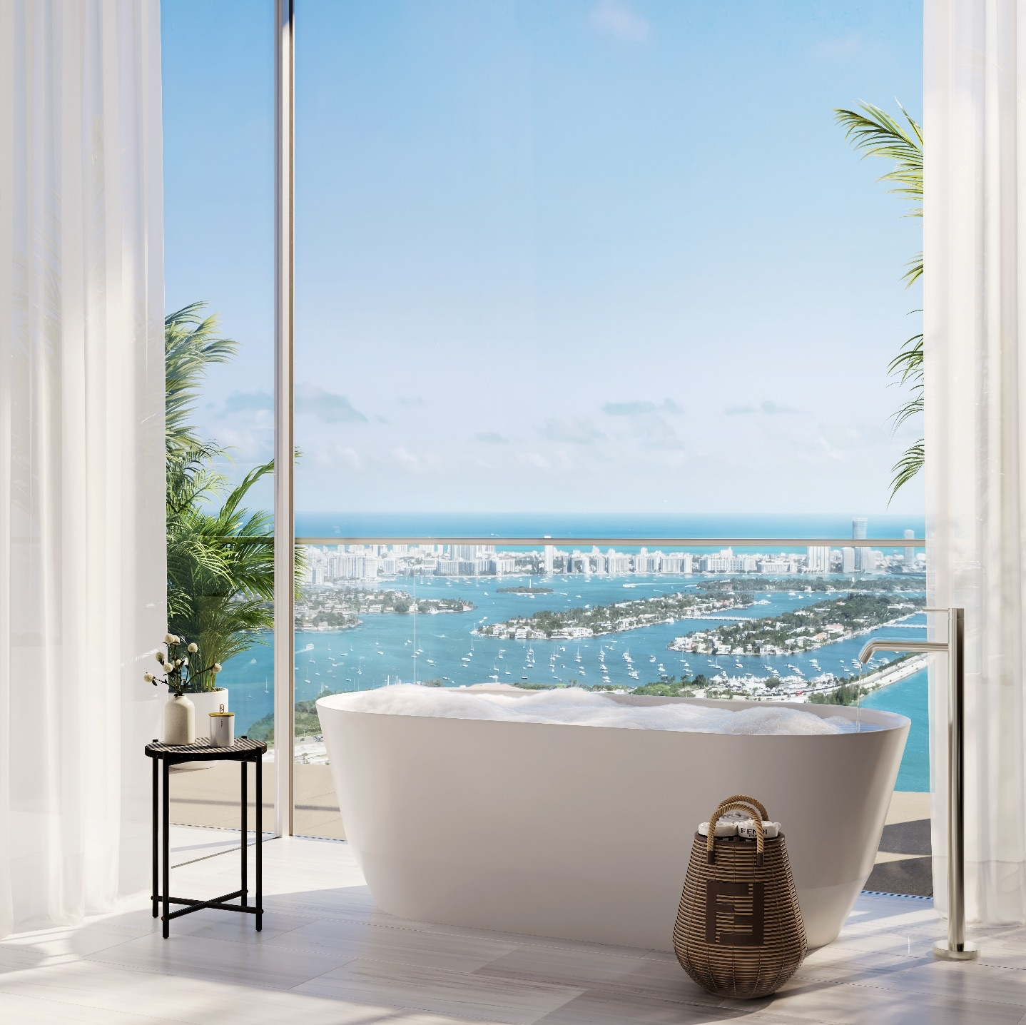 Perched atop a sculptural tower, the Sky Villas represent an exclusive collaboration with Fendi Casa demonstrating the pinnacle of design through a seamless blend of fashion, craftsmanship, and elevated living. Spanning the top floors, each Sky Villa features four bedrooms, four and a half bathrooms, a private library, and expansive wraparound terraces offering panoramic views of downtown Miami, Miami Beach and Biscayne Bay. Interiors are fully furnished with pieces from the Fendi Casa collection, showcasing bold Italian design through jewel-toned accents, geometric silhouettes and meticulous materiality. Signature elements, such as the Matrice bookcase and Metropolis coffee table, echo the grandeur of Fendi’s Roman heritage. From hand-stitched finishes and spa-like soaking tubs to private outdoor pools in select residences, every detail has been curated to deliver an immersive living experience that fuses timeless elegance with modern sophistication, offering residents a refined sanctuary suspended above the city.