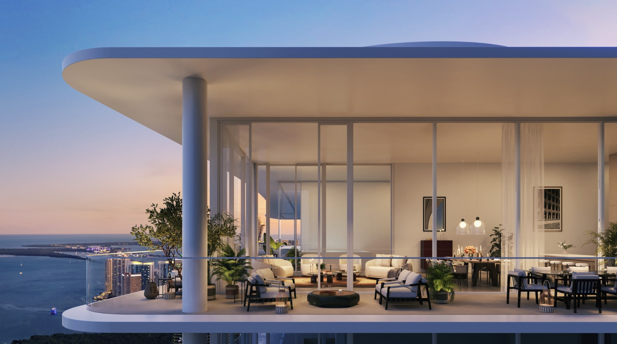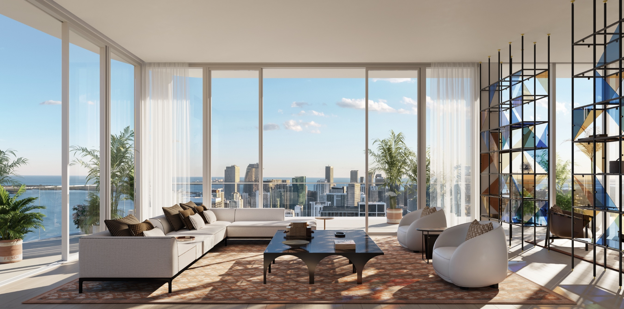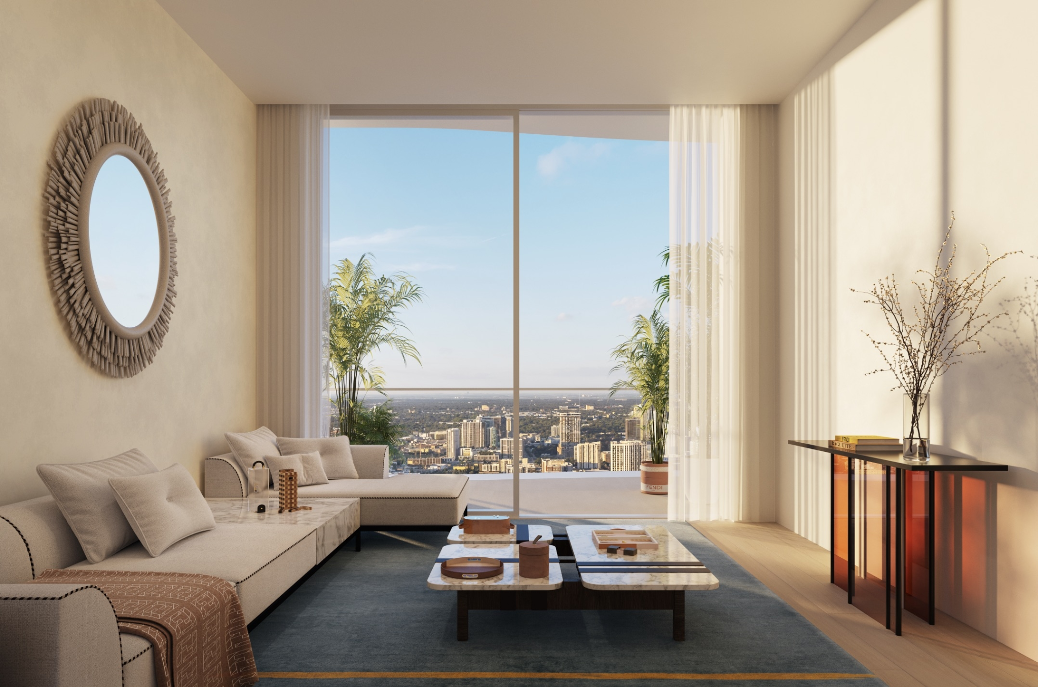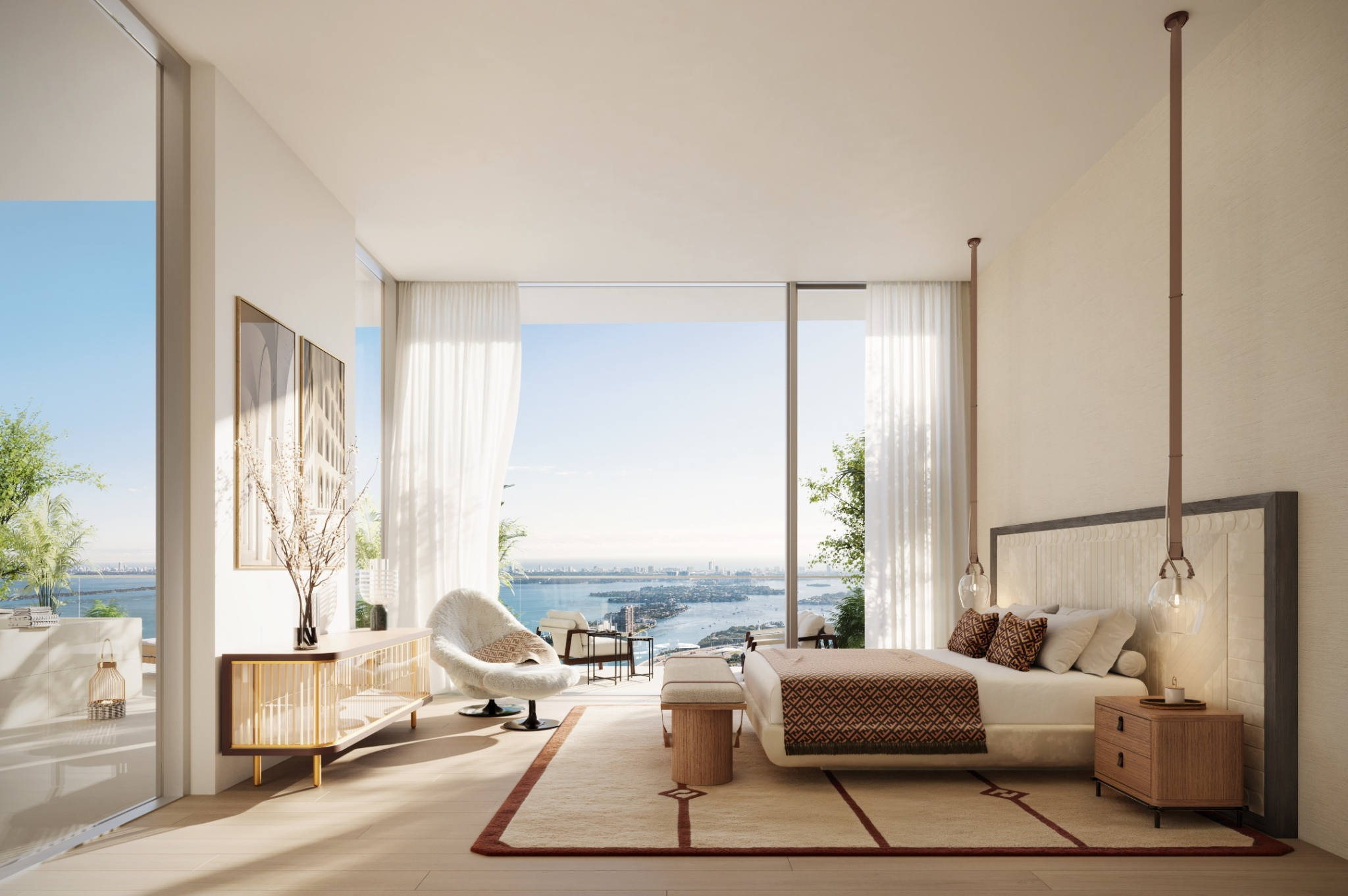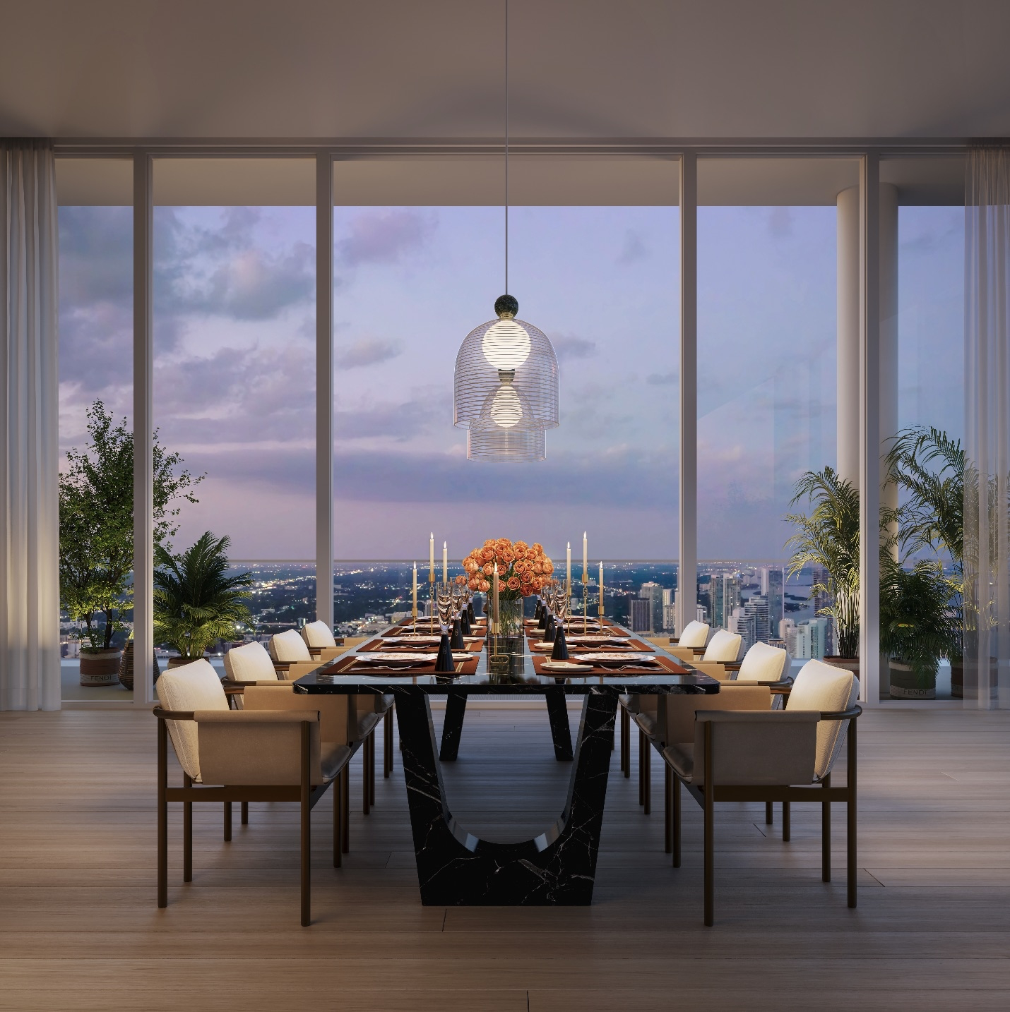Perched atop a sculptural tower, the Sky Villas represent an exclusive collaboration with Fendi Casa demonstrating the pinnacle of design through a seamless blend of fashion, craftsmanship, and elevated living. Spanning the top floors, each Sky Villa features four bedrooms, four and a half bathrooms, a private library, and expansive wraparound terraces offering panoramic views of downtown Miami, Miami Beach and Biscayne Bay. Interiors are fully furnished with pieces from the Fendi Casa collection, showcasing bold Italian design through jewel-toned accents, geometric silhouettes and meticulous materiality. Signature elements, such as the Matrice bookcase and Metropolis coffee table, echo the grandeur of Fendi’s Roman heritage. From hand-stitched finishes and spa-like soaking tubs to private outdoor pools in select residences, every detail has been curated to deliver an immersive living experience that fuses timeless elegance with modern sophistication, offering residents a refined sanctuary suspended above the city.